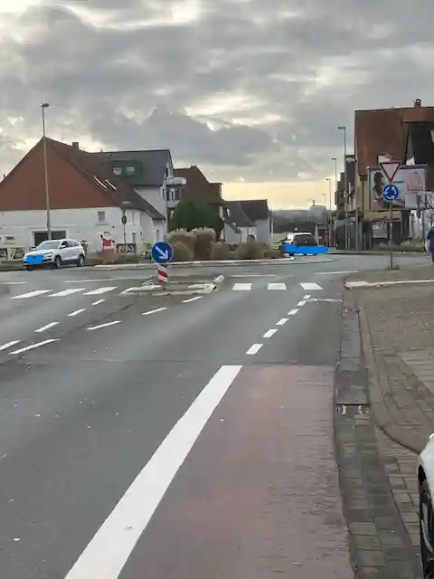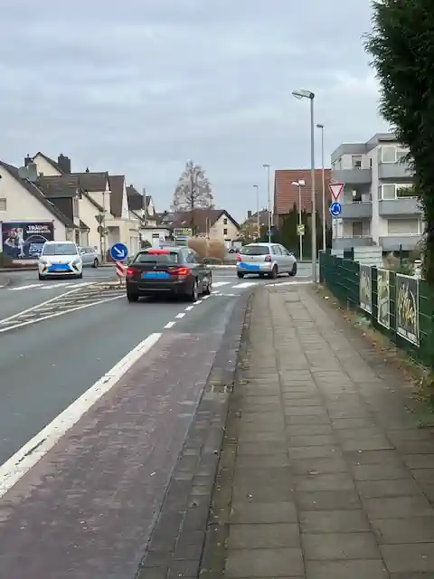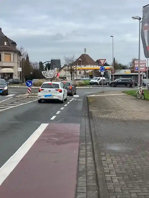 Im fünften Foto sieht man aus der Sicht des MIV die fast gerade Durchfahrt auf der Engerschen Straße. Auf dem sechsten Bild ist die Sicht auf die Durchfahrt zwar verdeckt, durch die Breite der Fahrbahn und die niedrige Bauweise des Mittelteils entsteht jedoch der Eindruck, ein vor dem Kreisverkehr nicht abgeschlossenes Überholen von Radfahrenden zügig durchführen zu können. Zu derartigen Manövern kommt es immer zu eher verkehrsarmen Zeiten.