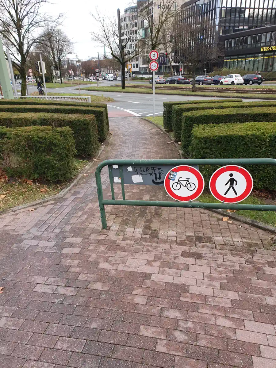 Sperre in Richtung AdenauerplatzIn der derzeitigen Gestaltung ist diese Sperre nicht mehr notwendig, da man über Furten bis zur anderen Seite der Einmündung Johannistal gelangen könnte. Allerdings gibt es zur Zeit noch keine Ampelsignalisierung für diese Verbindung, weshalb die Einfahrt für Radfahrende bzw. der Zutritt für Fußgänger verboten ist.